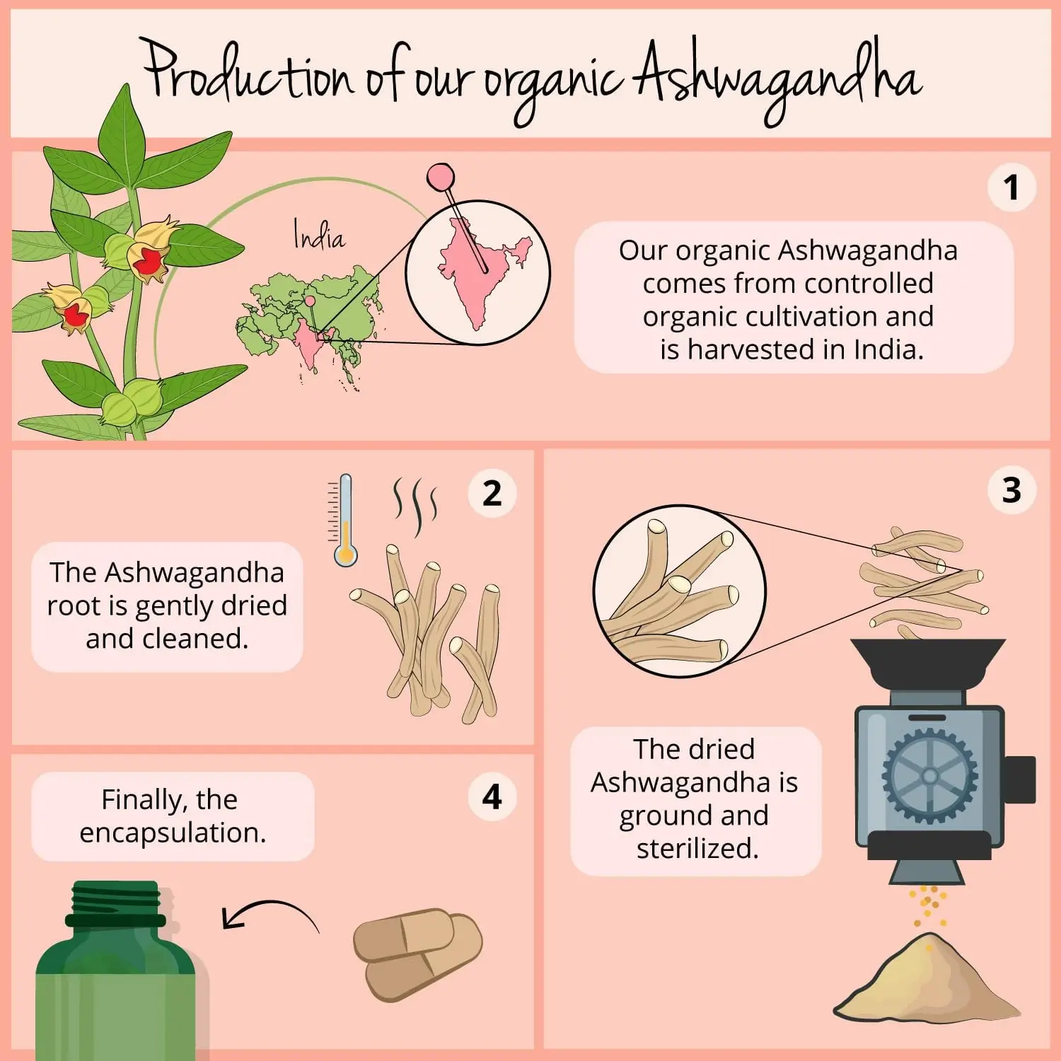 Kot pri vseh naših izdelkih posvečamo veliko pozornosti izvoru in najvišji kakovosti surovin, zato smo izbrali visokokakovosten prah ašvagande iz nadzorovane ekološke pridelave v Indiji. Poleg tega naši izdelki iz ašvagande vsebujejo vsaj 2 % vitanolidov. Da bi zagotovili optimalno kakovost, naš skrbno predelan prah ašvagande testiramo tudi na različne nečistoče, vključno z mikrobno kontaminacijo, ter ostanke pesticidov in težkih kovin.