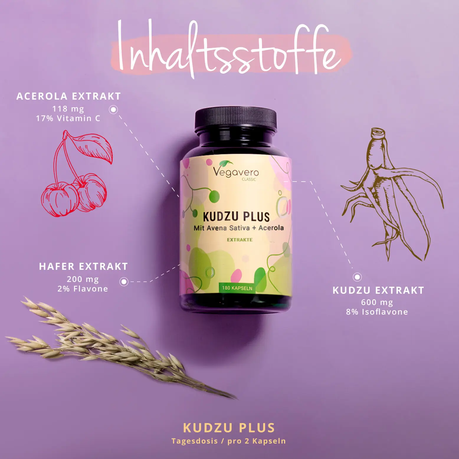 Naš Kudzu Plus smo razvili ob upoštevanju optimalne sinergije in biološke uporabnosti sestavin. Zaradi tega smo izbrali koncentriran izvleček korenine Kudzuja (Pueraria montana), ki je standardiziran na 8 % izoflavonov. Na ta način lahko zagotovimo idealno koncentracijo najpomembnejših bioaktivnih spojin, ki jih najdemo v kudzuju. Ker ima oves (Avena sativa) podobne lastnosti kot kudzu glede na tradicionalno uporabo, smo v naš izdelek vključili tudi izvleček ovsa. Nenazadnje smo dodali naravni vitamin C iz jagod acerole za popolnoma sinergistično in povsem naravno formulo. Seveda naš Kudzu Plus ne vsebuje nobenih umetnih dodatkov, ki jih običajno najdemo v drugih izdelkih kudzu, kot so magnezijev stearat, mikrokristalna celuloza ali celo želatina. Kot vedno je naš dodatek popolnoma veganski in brez GSO!