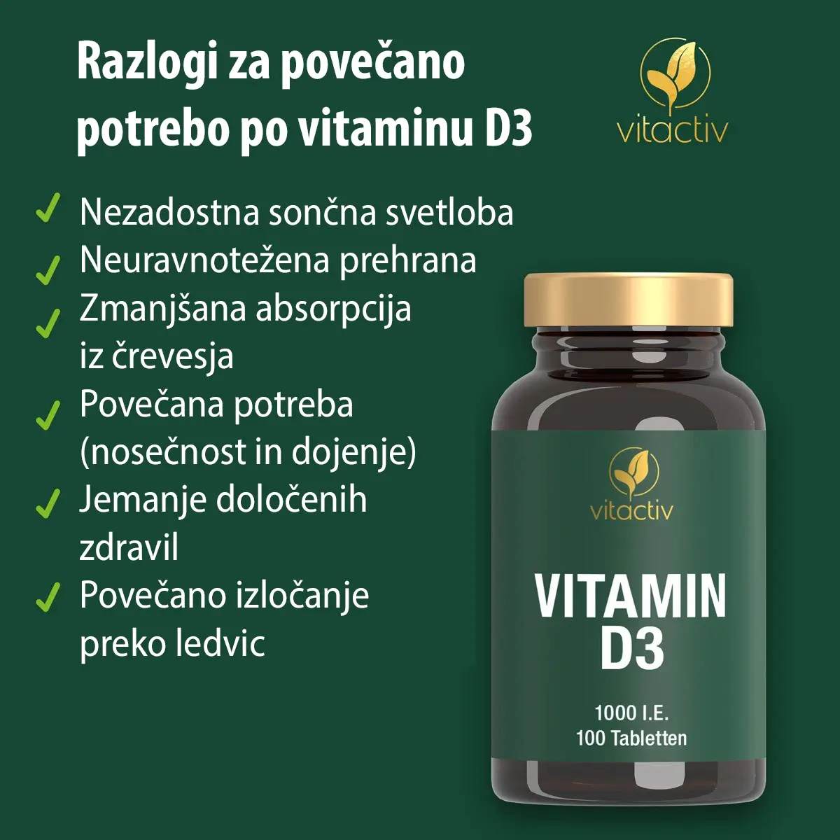 Vitamin D3 je najpomembnejša fiziološka oblika vitamina D in služi kot predhodnik, iz katerega se lahko proizvaja vitamin D – za vzdrževanje normalnih kosti, za normalno absorpcijo in izkoriščanje kalcija ter za normalno raven kalcija v krvi.*